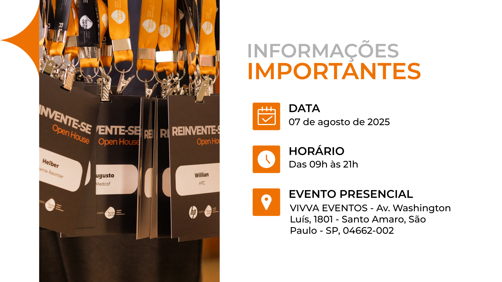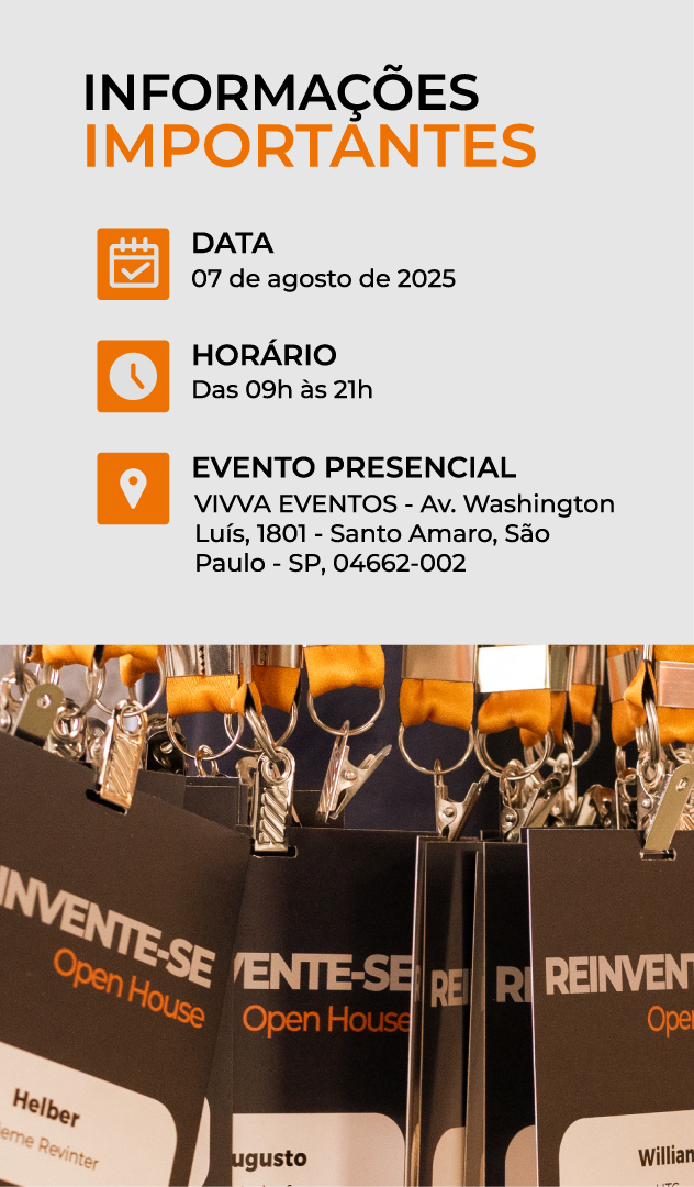 O Reinvente-se é um evento dinâmico focado em negócios, inovação e networking. Aqui, reunimos grandes profissionais e especialistas para palestras envolventes sobre tecnologia, tendências de mercado e estratégias de negócios. Nosso objetivo é impulsionar conexões poderosas, compartilhar insights valiosos e estimular você a reinventar sua forma de pensar, agir e crescer profissionalmente.